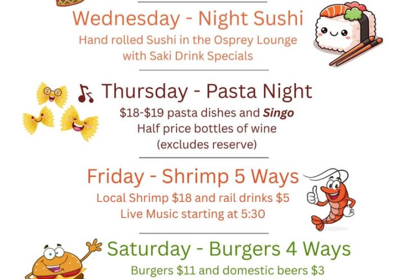 Sushi Night🍣 swipe for dinner specials or join us in the Osprey Lounge for Sushi every Wednesday! #waterfrontdining #sushi