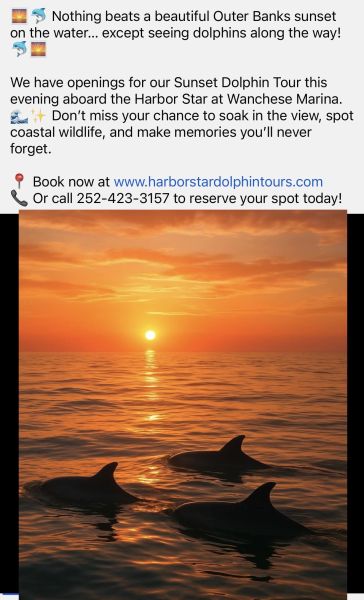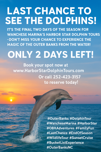#OuterBanks #DolphinTour #WancheseMarina #HarborStar #OBXAdventures #FamilyFun #LastChance #EndOfSeason #WildlifeTour #SunsetCruise #BucketListExperience #OuterBanksNC